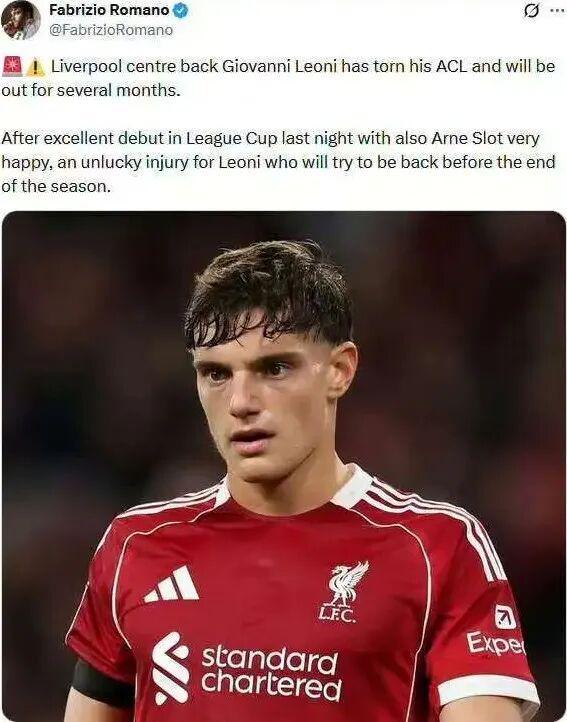 “萊奧尼在聯(lián)賽杯首秀中表現(xiàn)出色、斯洛特對(duì)他十分滿意,但他卻不幸受傷。萊奧尼將努力爭(zhēng)取在本賽季結(jié)束前回歸?!?/p>