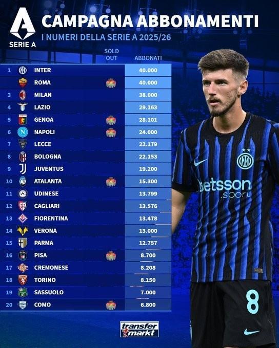 直播吧9月25日訊 2025-26賽季意甲各隊季票銷售數(shù)量榜出爐,其中國米、羅馬4萬張并列第一。