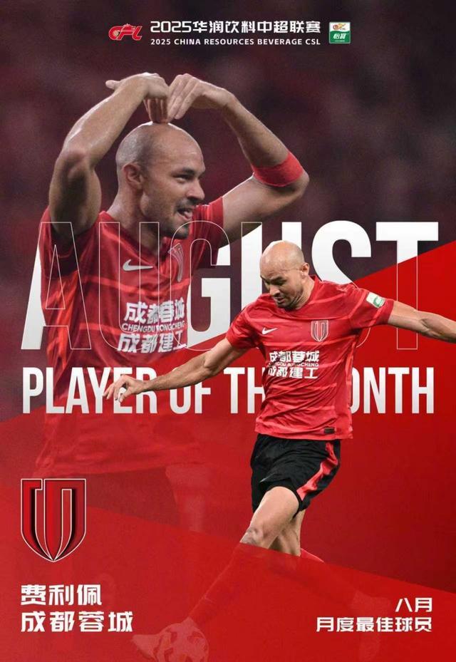 兩場(chǎng)梅開(kāi)二度,官方:蓉城前鋒費(fèi)利佩當(dāng)選中超聯(lián)賽8月最佳球員