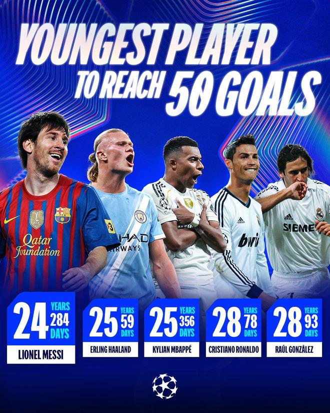 歐冠最年輕50球排名:梅西居首,哈蘭德姆巴佩分列二三