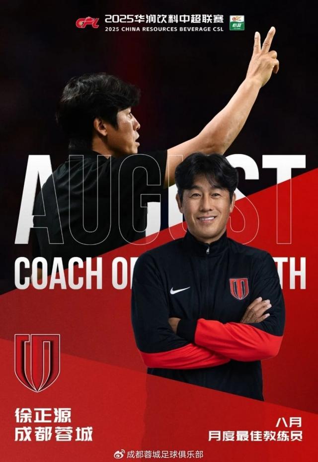直播吧9月25日訊 日前,成都蓉城主帥徐正源當(dāng)選中超聯(lián)賽8月最佳教練。