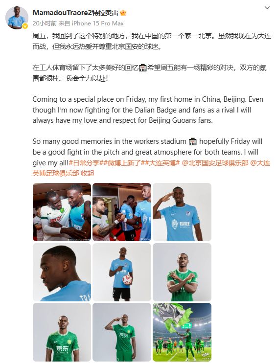 馬馬杜表示:“周五,我回到了這個特別的地方,我在中國的第一個家—北京。雖然我現(xiàn)在為大連而戰(zhàn),但我永遠熱愛并尊重北京國安的球迷。在工人體育場留下了太多美好的回憶,希望周五能有一場精彩的對決,雙方的氛圍都很棒。我會全力以赴!”