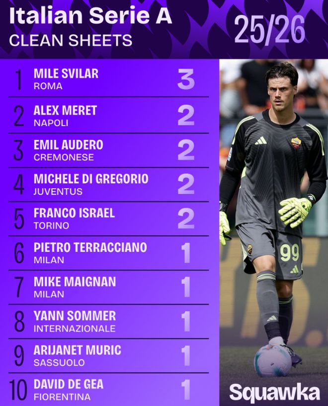 值得一提的是,斯維拉爾2025年24場意甲聯(lián)賽保持14場零封,這項數(shù)據(jù)也是意甲第一。
