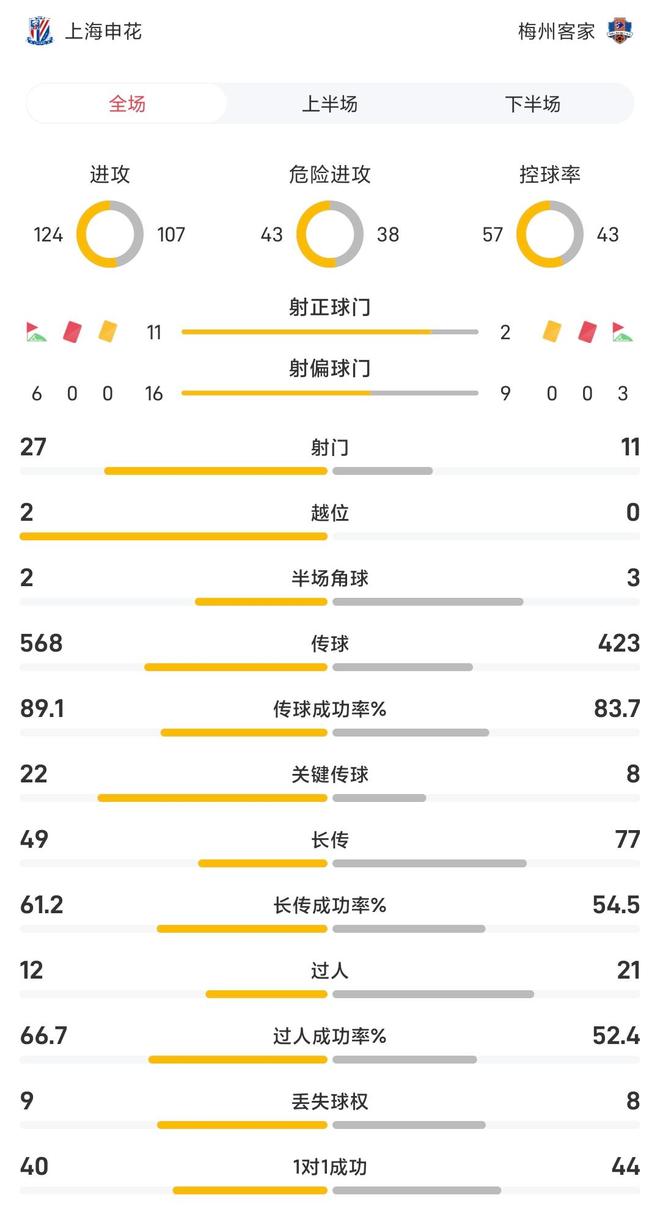 申花61梅州全場數據:申花狂轟27腳射門,控球率57