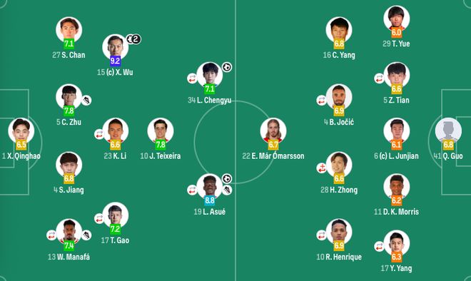 前衛(wèi):17-楊一虎(75'20-王嘉楠)、10-羅德里格-恩里克(F)(75'14-季勝攀)、16-楊超聲