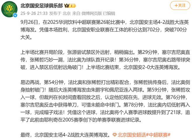 新京報(bào)訊 據(jù)北京國安足球俱樂部官博消息,9月26日,在2025華潤飲料中超聯(lián)賽第26輪比賽中,北京國安主場4-2戰(zhàn)勝大連英博海發(fā)。憑借本場勝利,北京國安職業(yè)聯(lián)賽在工體的積分達(dá)到702分,突破700分大關(guān)。