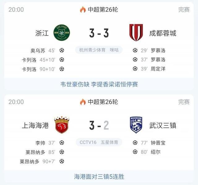 而在20:00同時開球的兩場爭冠球隊的比賽中,上海海港在1-2落后的情況下連追兩球,并且由萊昂納多完成讀秒絕殺武漢三鎮(zhèn);而成都在40分鐘3-0領先的情況下,被浙江隊連追3球扳平比分,外援亞戈完成絕平,這讓成都蓉城白白丟掉了2分。本輪開始前,成都與海港同積54分,而在兩場比賽結束后,海港57分反超55分的成都登上榜首。