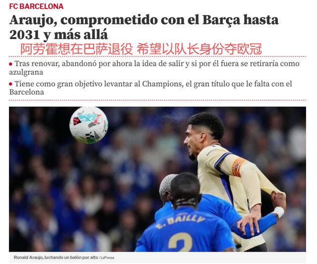 《世界體育報》指出,阿勞霍一度考慮離開巴薩,尤其是2024年夏窗、2025年冬窗。不過1月23日,阿勞霍與巴薩續(xù)約至2031年,6500萬歐元解約金條款失效,烏拉圭悍將下定決心,要在巴薩踢出名堂。