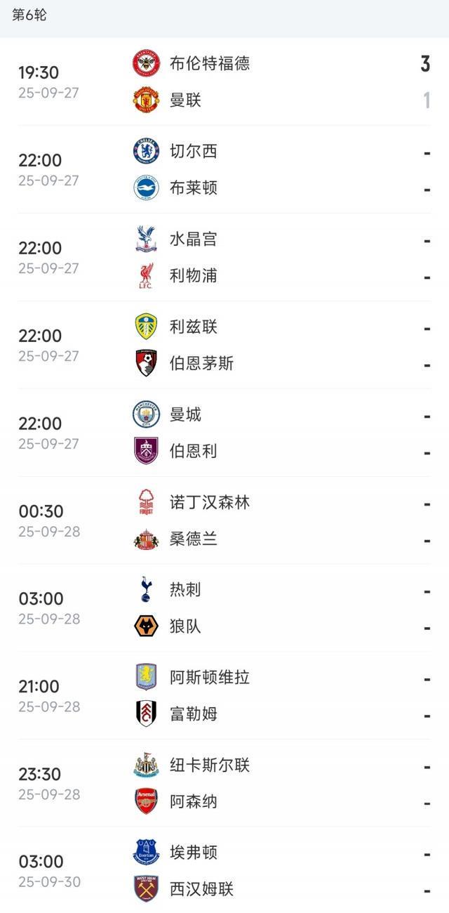 直播吧09月27日訊 英超第6輪先賽一場,曼聯(lián)客場1-3負于布倫特福德,開局6輪7分暫居英超第13,完整積分榜如下↓