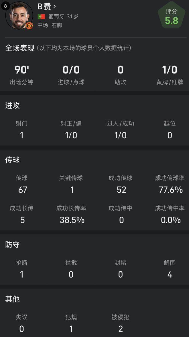 B費全場數(shù)據(jù):表現(xiàn)低迷罰丟點球,進球助攻均為0