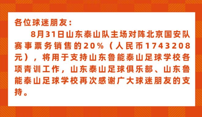 山東泰山足球俱樂部在官方公告中寫道:“8月31日山東泰山隊主場對陣北京國安隊賽事票務(wù)銷售的20%(人民幣1743208元),將用于支持山東魯能泰山足球?qū)W校各項青訓(xùn)工作,山東泰山足球俱樂部、山東魯能泰山足球?qū)W校再次感謝廣大球迷朋友的支持。”