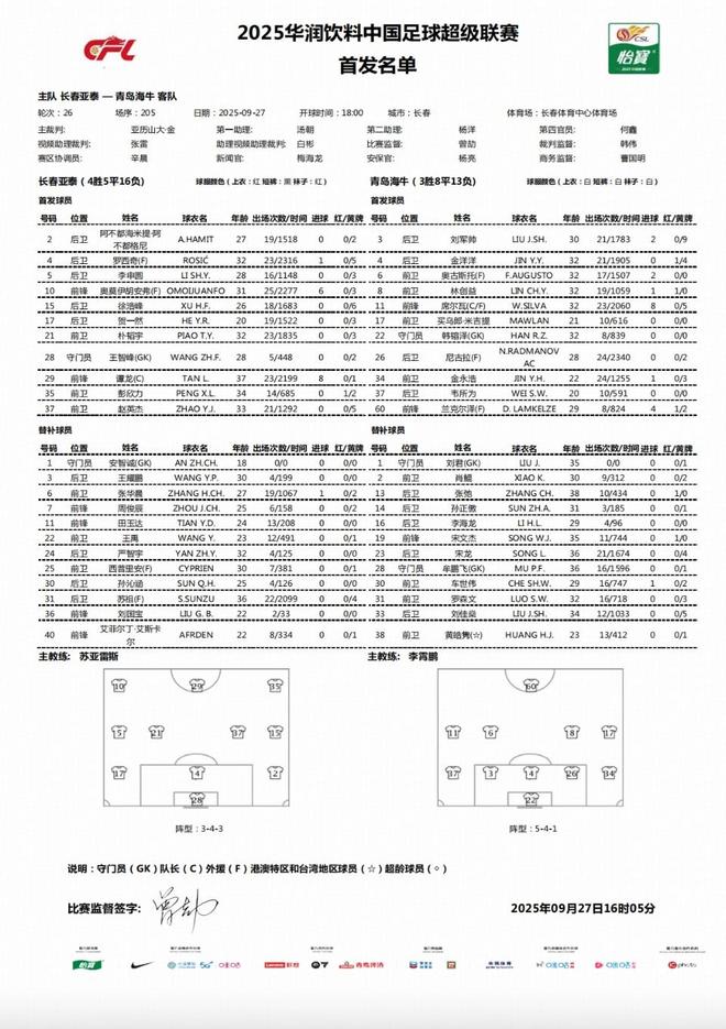 北京時間9月27日18:00,中超聯(lián)賽第26輪焦點保級戰(zhàn),長春亞泰坐鎮(zhèn)主場迎戰(zhàn)青島海牛,賽前雙方首發(fā)陣容: