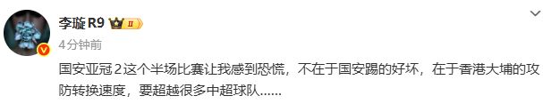 媒體人社媒發(fā)文熱議國安1-2落后,李璇寫道:“國安亞冠2這個半場比賽讓我感到恐慌,不在于國安踢的好壞,在于香港大埔的攻防轉(zhuǎn)換速度,要超越很多中超球隊。”