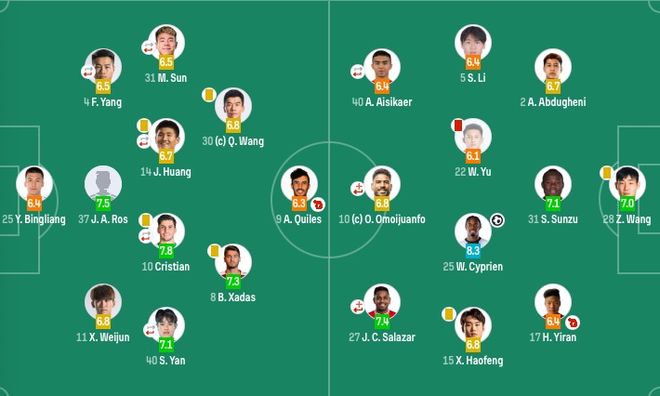 前鋒:10-奧莫伊胡安弗(F)(82'20-玄智?。?7-胡安-卡米洛(F)(95'29-譚龍)、40-艾菲爾?。?8'21-樸韜宇)
