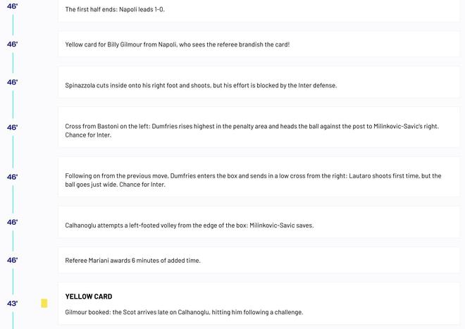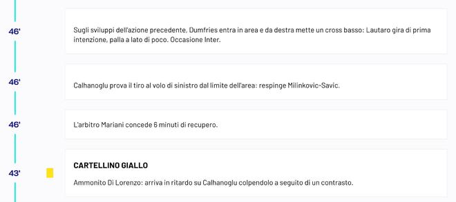 比賽的轉(zhuǎn)播畫面和意甲官網(wǎng)的文字直播原本都顯示吉爾摩在第43分鐘飛鏟恰爾汗奧盧犯規(guī)吃到黃牌,隨后第46分鐘這位蘇格蘭球星又拉倒鄧弗里斯破壞國(guó)米反擊再次染黃,正當(dāng)人們困惑為什么當(dāng)值主裁馬里亞尼沒有向吉爾摩出示紅牌的時(shí)候,意甲官方隨后對(duì)他們的文字直播內(nèi)容進(jìn)行了更正,他們將第一張黃牌的得牌球員更改為了迪洛倫佐。