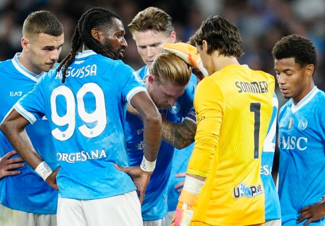 第33分鐘,迪洛倫佐被放倒,裁判判罰點球。德布勞內主罰,他穩(wěn)穩(wěn)把球罰進,幫助那不勒斯取得領先。而德布勞內因此拉傷了,不得不被換下場,有些倒霉。第40分鐘,巴斯托尼差一點進球,他的頭球攻門擊中了橫梁彈出。半場補時階段,鄧弗里斯頭球攻門,皮球擊中立柱彈出底線。半場結束,那不勒斯1-0領先國際米蘭。